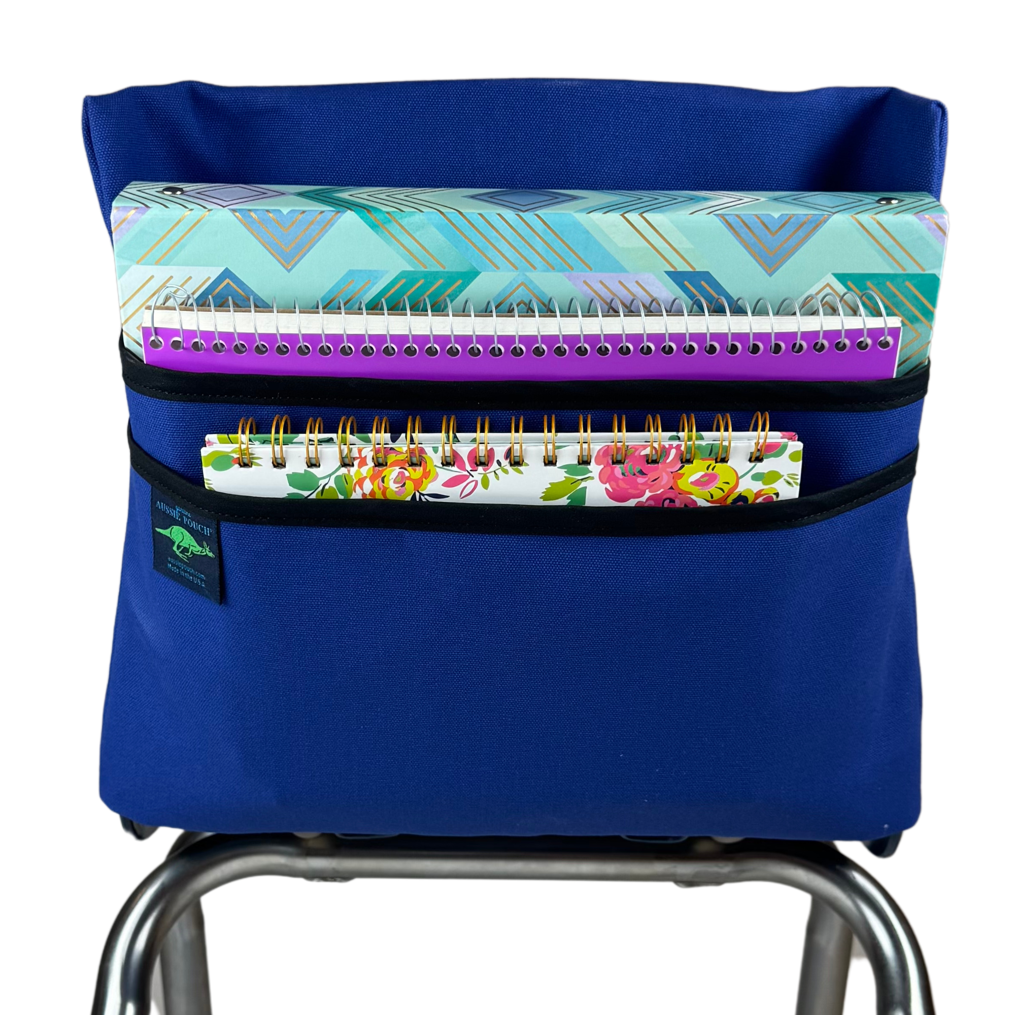 Limited edition! Aussie Pouch® Classic Chair Pocket in blue canvas fabric!  Only available in Medium 15" size, with black trim.  The Classic style has two large pockets to hold a variety of school supply items.  Aussie Pouches are the premier school chair pocket: manufactured to last up to 10 years, machine washable, and made in the USA!