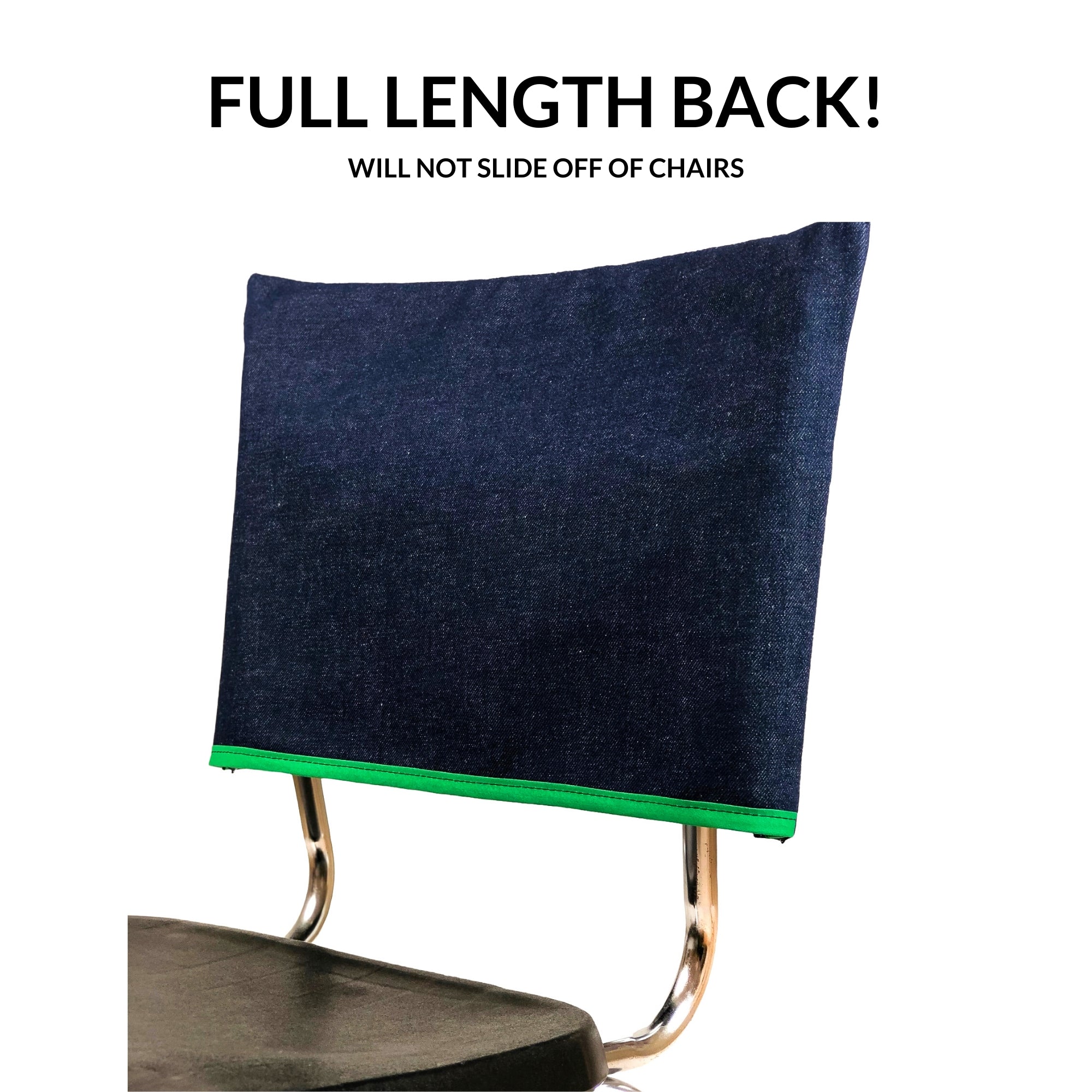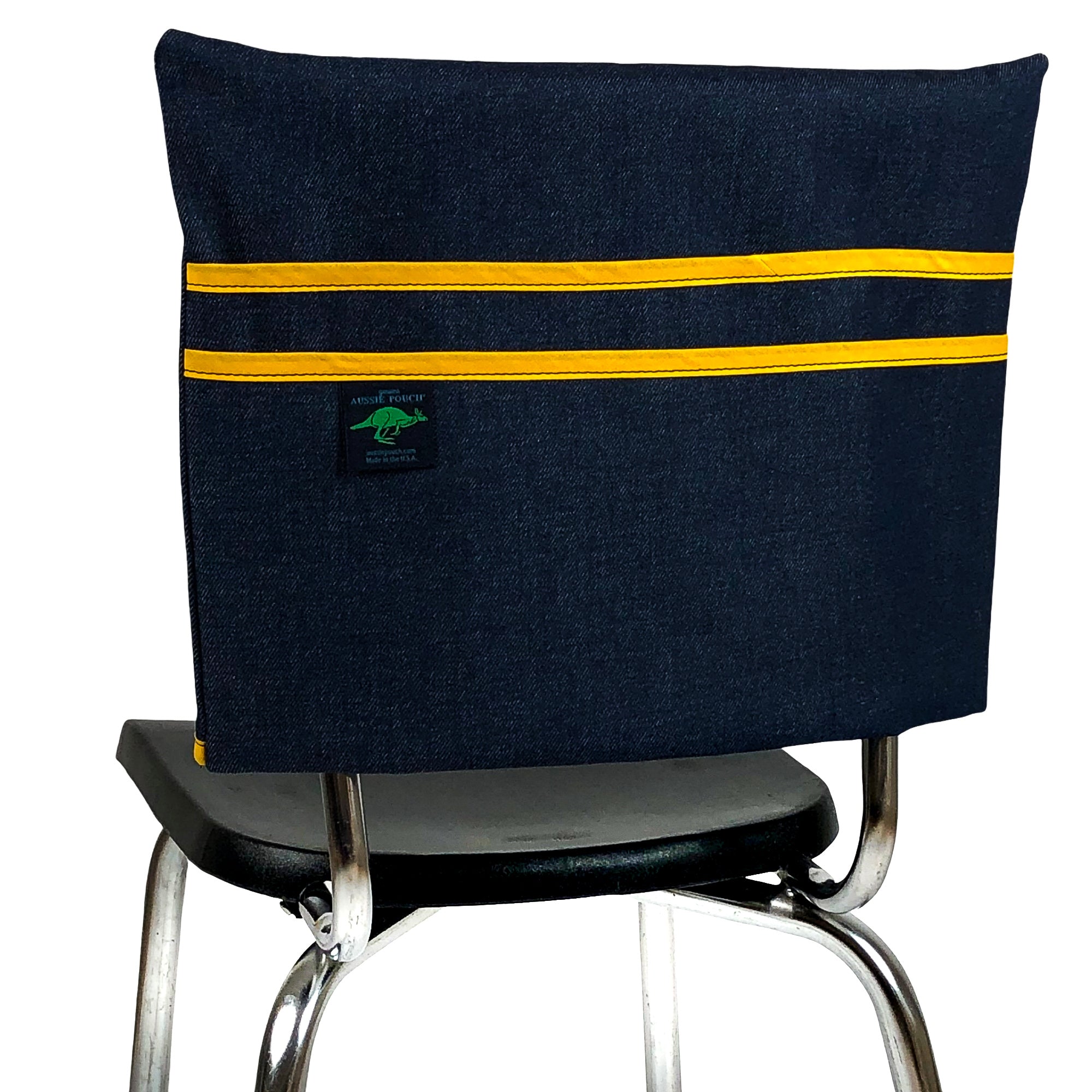 The Aussie Pouch® Classic Chair Pocket is made with premium denim fabric and has two large pockets to hold a variety of school supply items. It is available in seven sizes and eleven trim colors. Aussie Pouches are the premier school chair pocket: manufactured to last up to 10 years, machine washable, and made in the USA!