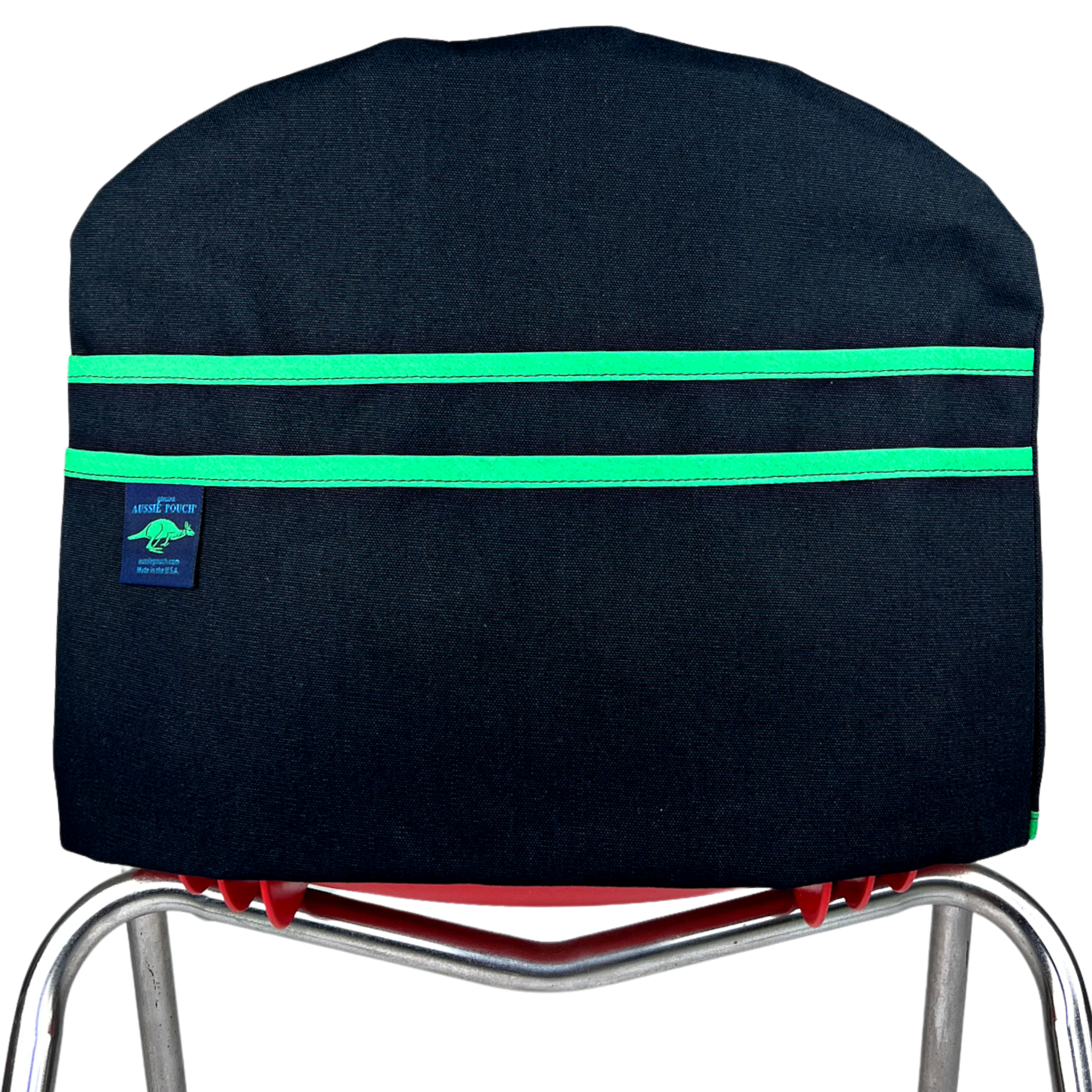 This Curve Chair Pocket is made with premium 10oz black canvas fabric and has two large pockets to hold a variety of school supply items. It is available in three sizes and eleven trim colors. Aussie Pouches are the #1 Teacher-Recommended school chair pocket. Made in the USA.