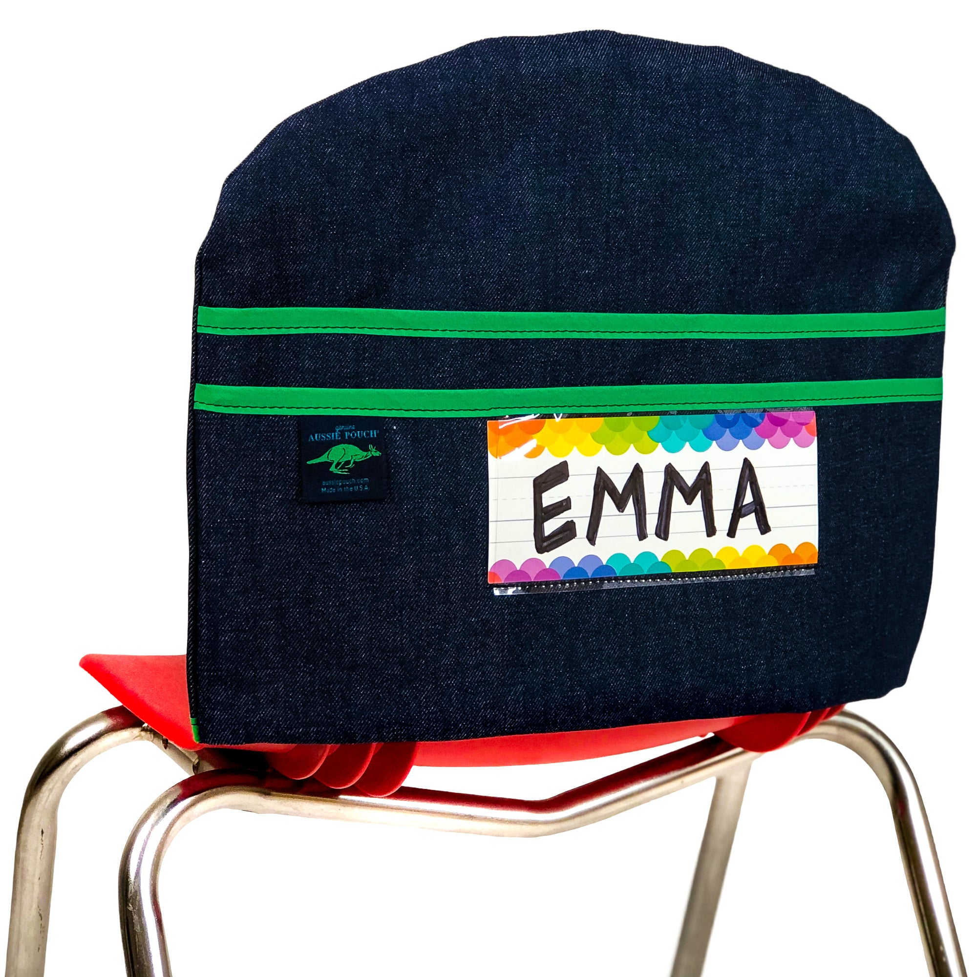 This Curve Chair Pocket with Name Tag Holder is made with premium denim fabric and has two large pockets to hold a variety of school supply items. It is available in three sizes, eleven trim colors, and includes a clear plastic name tag holder. Aussie Pouches are the premier school chair pocket: manufactured to last up to 10 years, machine washable, and made in the USA!
